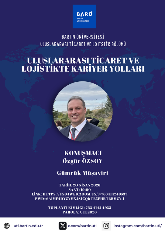 Our online career event titled "Career Paths in International Trade and Logistics," featuring Customs Consultant Özgür ÖZSOY, will be held on Monday, April 20th at 7:00 PM via Zoom. We welcome all students to the event.